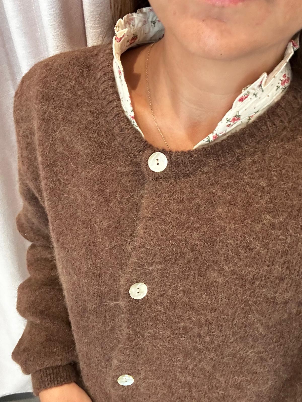 Blusa beige con estampado floral en tonos rosas. Cuello con pequeños volantes abierta en pico. Hombros con pequeños volantes.
